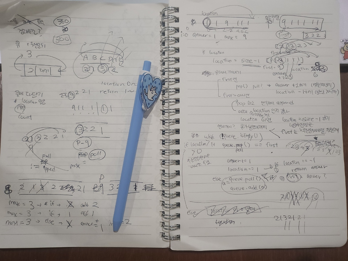 이 문제를 풀 때 중요하게 짚고 여겨야 했던 부분은, 제가 생각하기에 큐의 요소가 삭제되고 뒤로 들어오며 변하는 location의 위치를 잃지 않는 것. 그리고 우선순위를 검사하는 것.입니다.