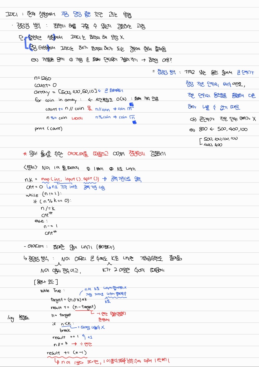 그리디 알고리즘은 아이디어를 통해 가장 최적인 선택을 해야 하고 그 선택이 전체적으로 최적인 해결책을 이끌어내야 한다.