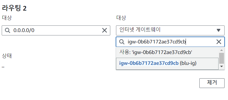 0.0.0.0/0(외부 아이피 대역)이 목적지일 때, 인터넷 게이트웨이로 나가도록 설정해줍니다!