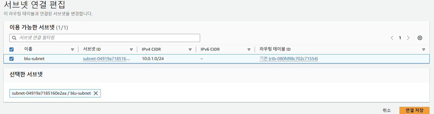 해당 라우팅 테이블을 원하는 서브넷에 연결을 해줍니다!